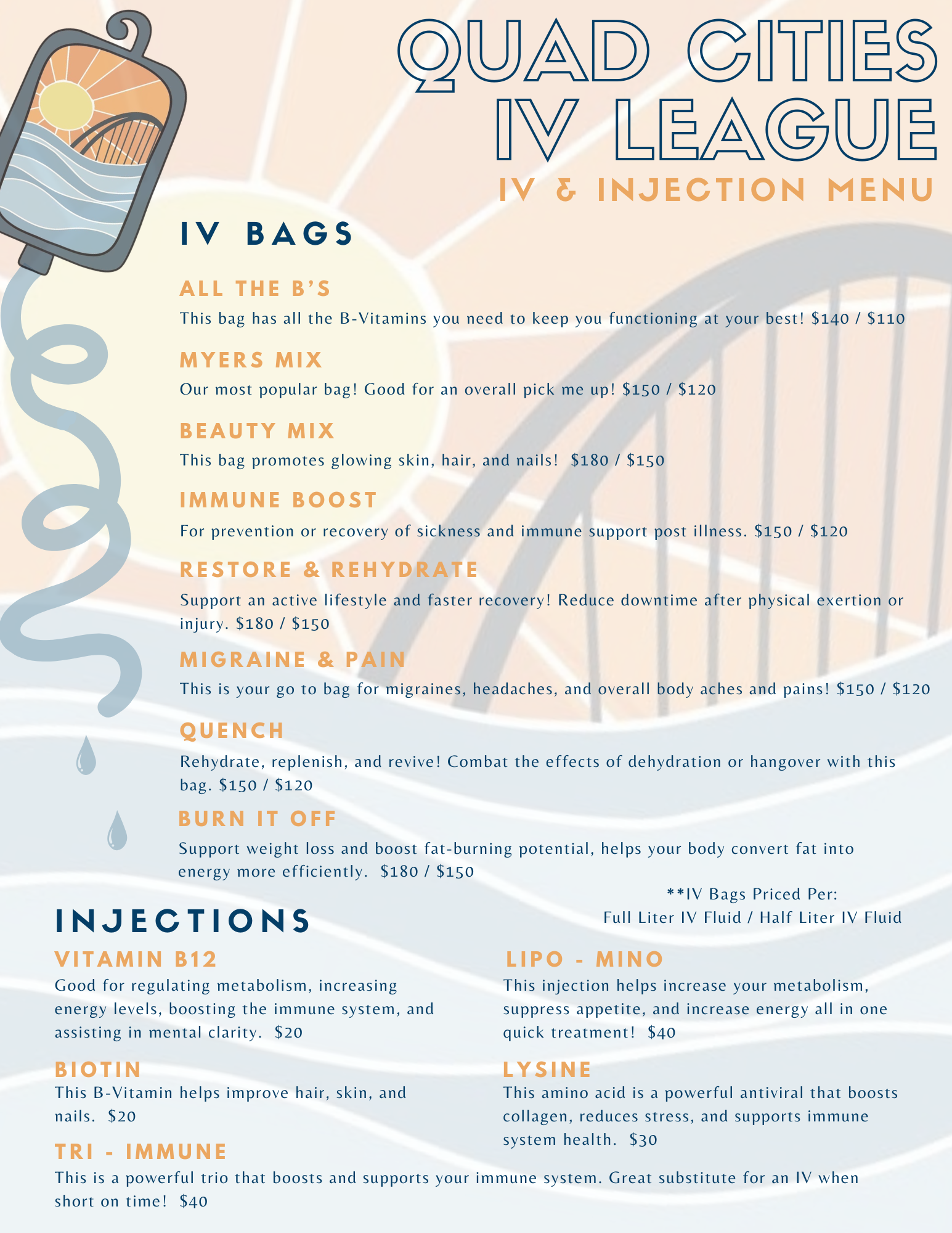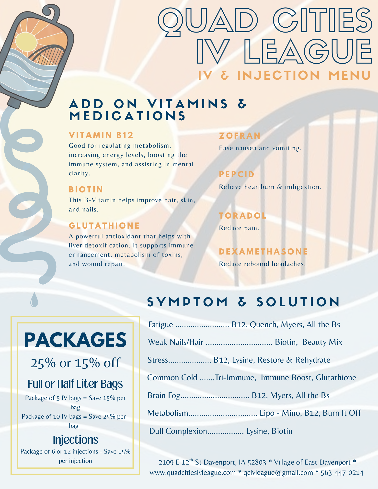 Buy in bulk and save money! Ask us about IV bag packages at your next appointment!
