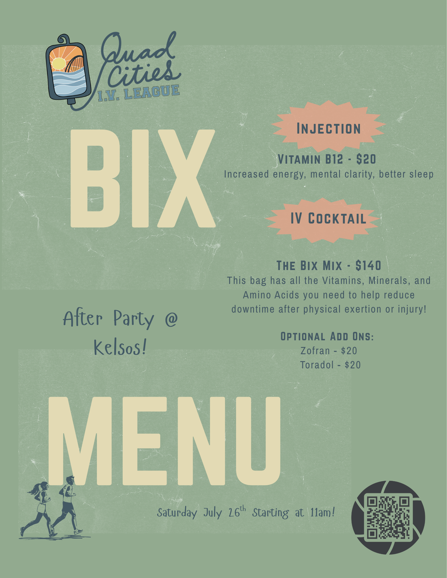 We also create custom event menus, like our featured Bix Weekend menu, tailored specifically to your participants, schedule, and event size. Whether it’s a large marathon, charity ride, or local club run, we bring a premium wellness experience directly to your event.We partner directly with race directors, cycling events, running clubs, and local organizations to deliver on-site IV therapy experiences. Our team can fully set up at your event—before, during, or after—to provide athletes with fast, effective hydration and recovery solutions.